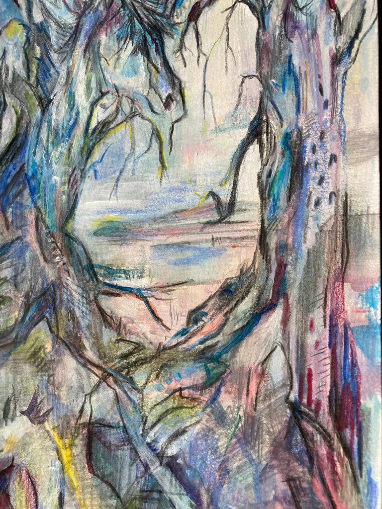 This painting made a weeks or so ago ‘Walking with Trees’ is acrylic, pastel and pencil on paper. I found myself enjoying the flexibility I found. A stepping stone drawing.